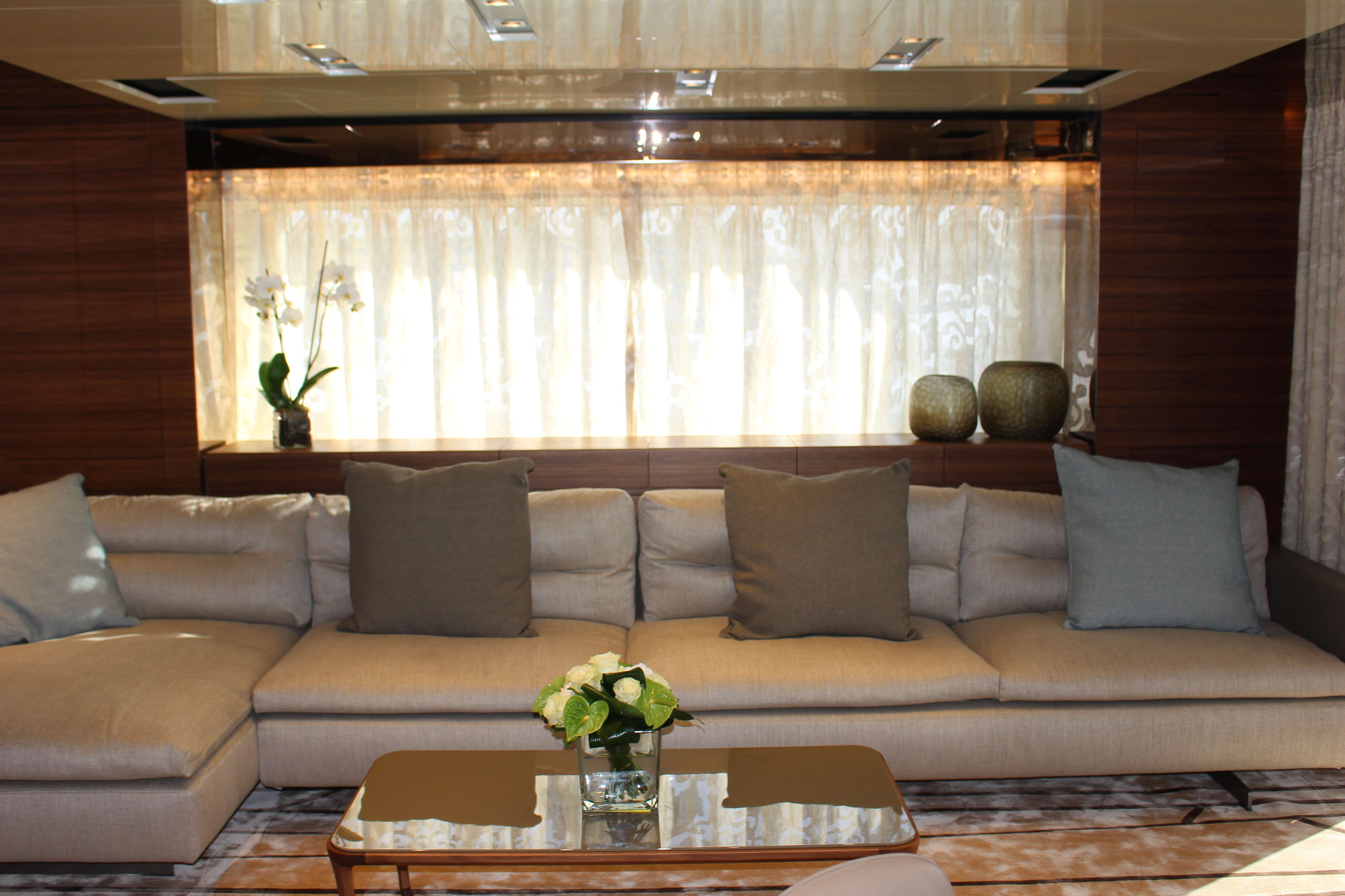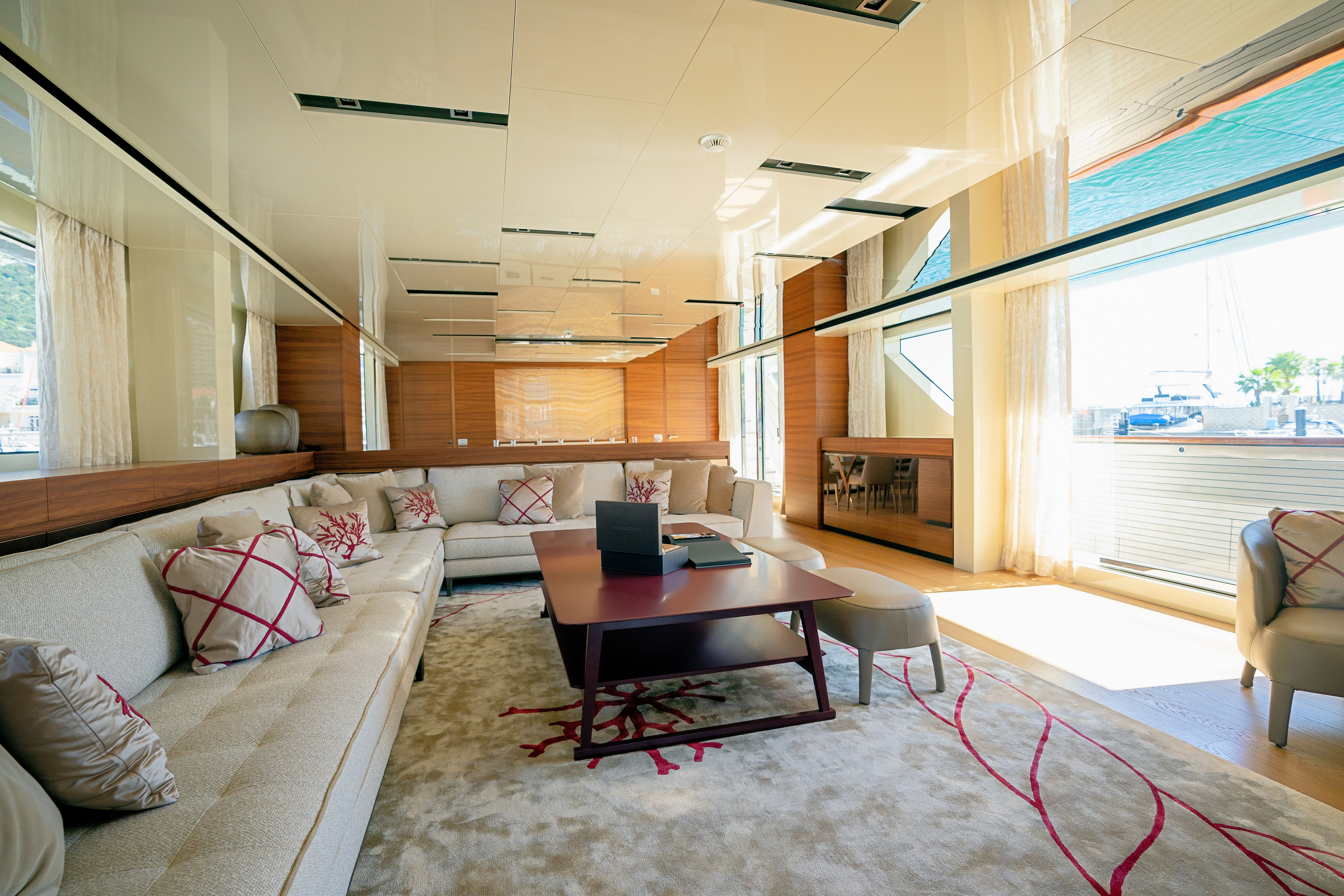 Furniture: stern cabinets at entrance with storage on forward and aft of dining area, Maxalto sofa, poufs, coffee table and dining furniture, Sahrai silk rug in lounge area,sliding door to Starboard with balcony
