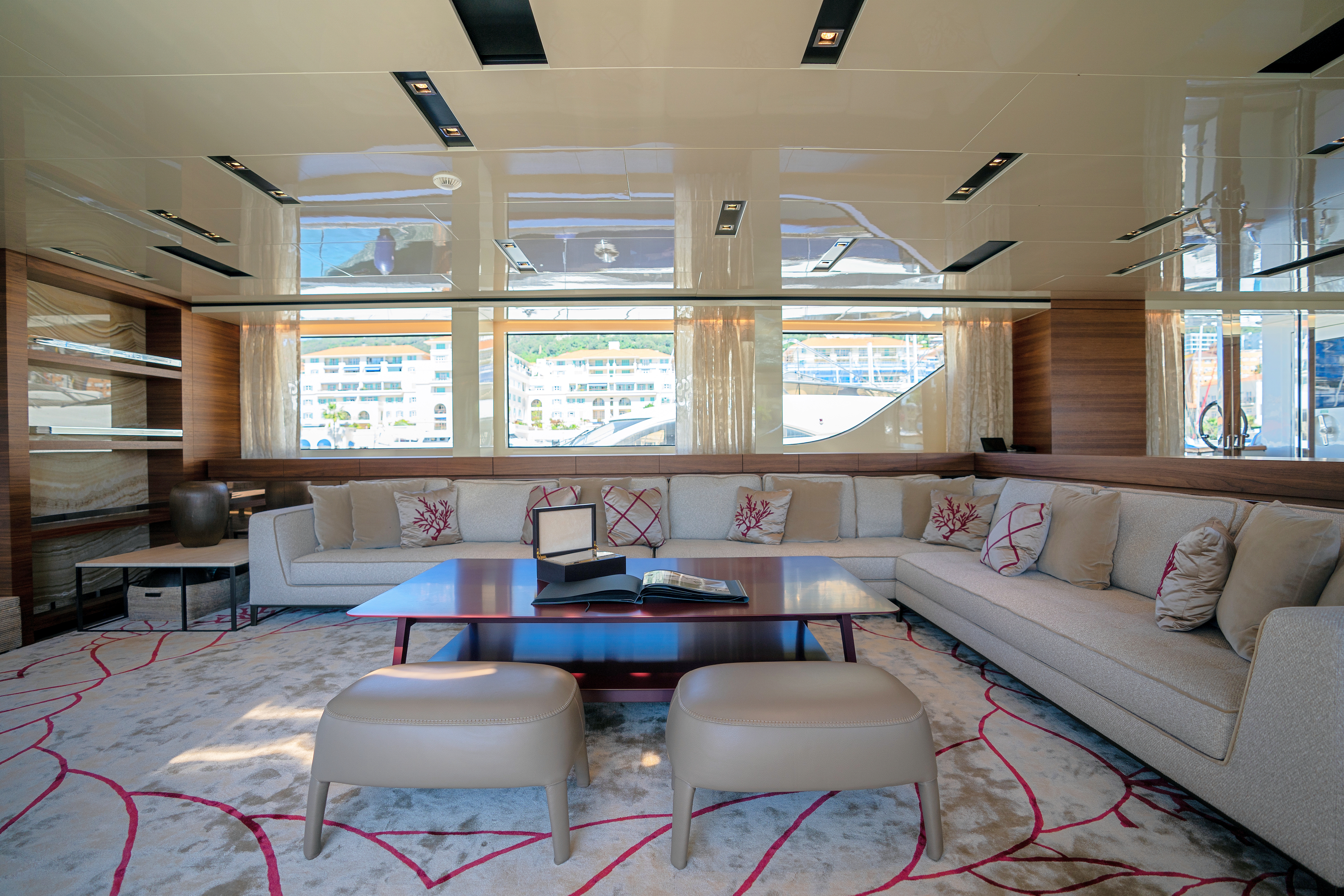 Furniture: cabinets to port side, bar port forwards, Poltrona Frau sofa, Ceccotti coffee table and chairs, Giorgetti gaming table and bar stools
