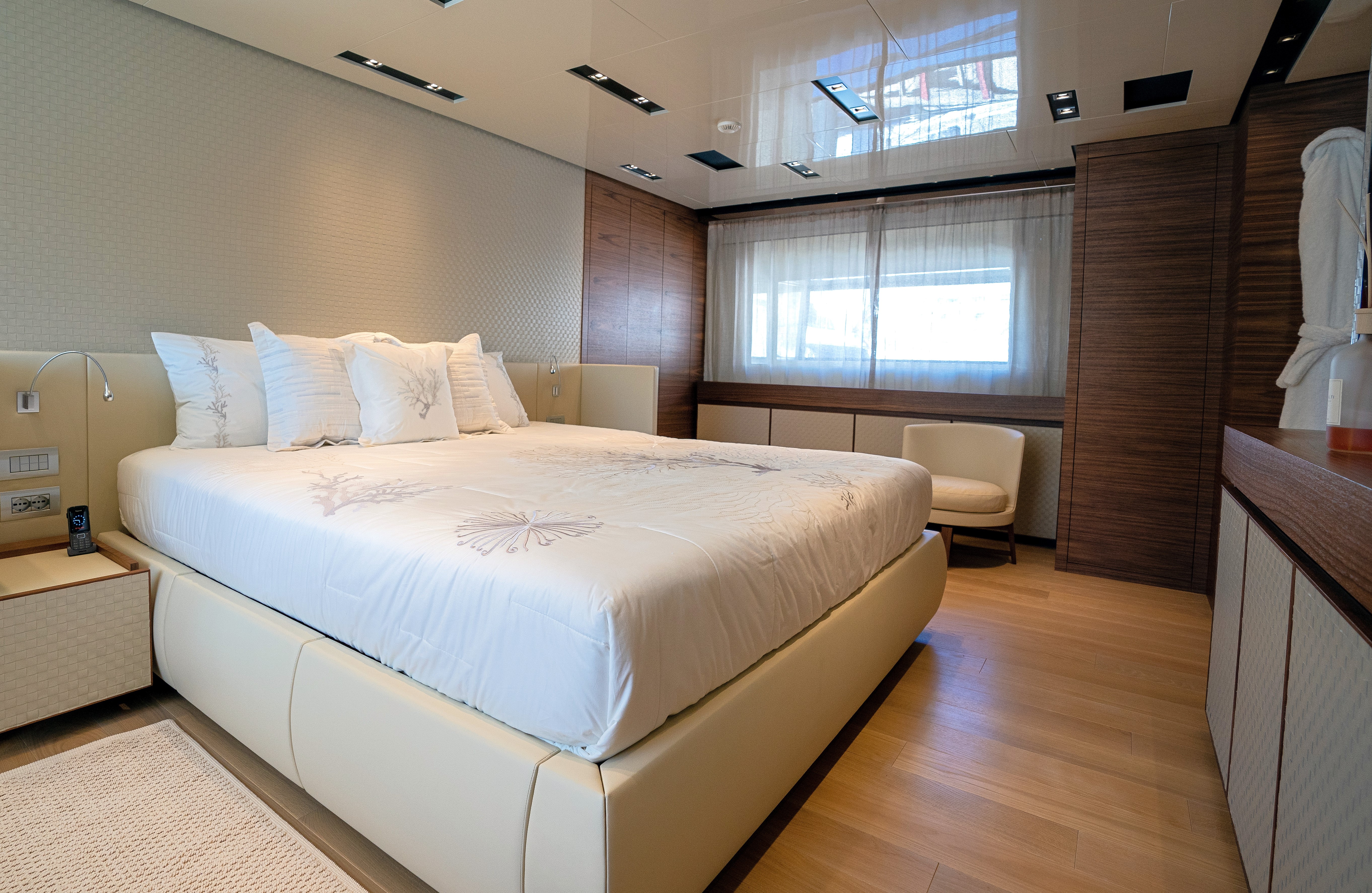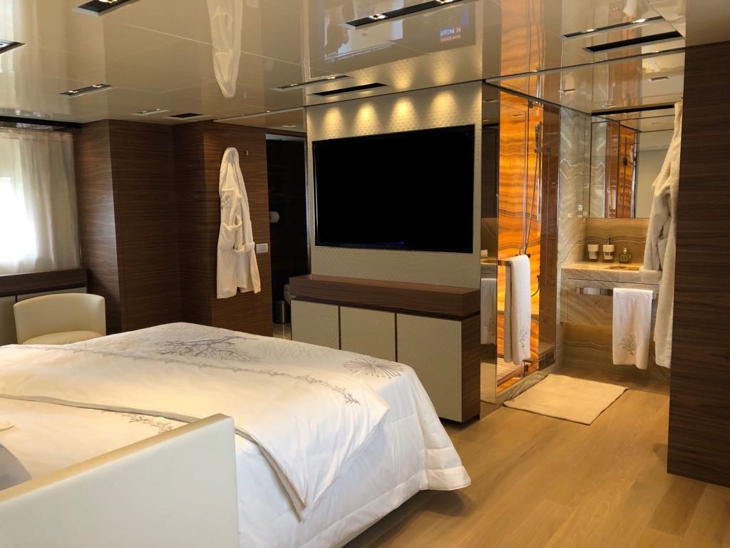 Walk-in wardrobe on entry, desk in hallway, storage on starboard and portside, central king size bed, nightstands, sofa forwards