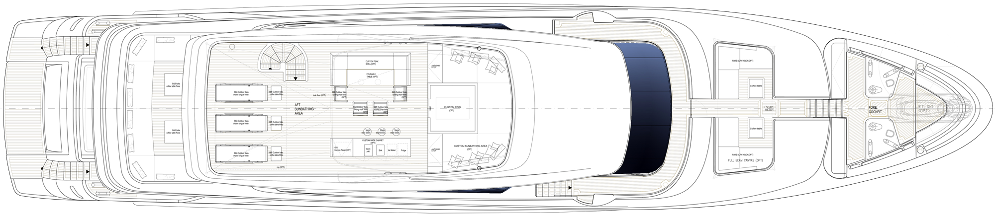 5 cabins layout: master cabin on main deck bow. Side terrace on salon port side.