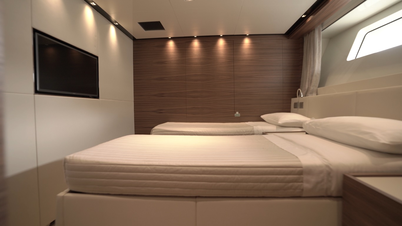 No. 2 double beds (with sliding system in starboard cabin to convert to singles), nightstand, wardrobe, mirror covered TV